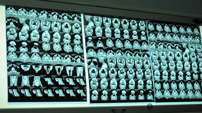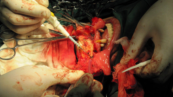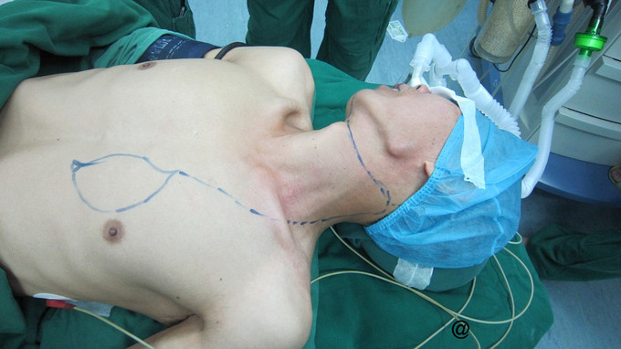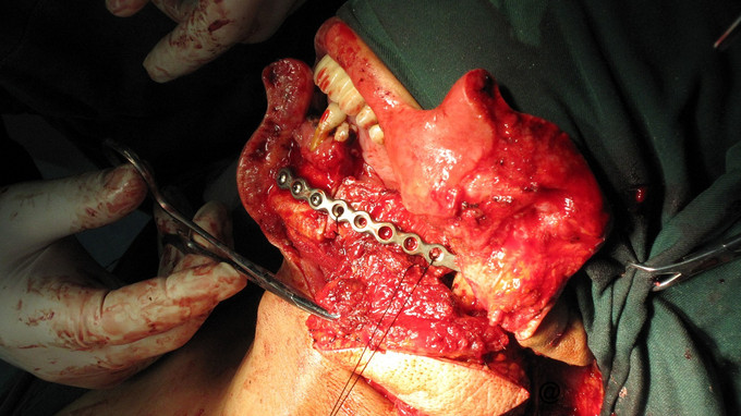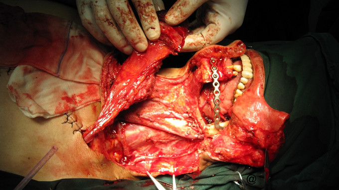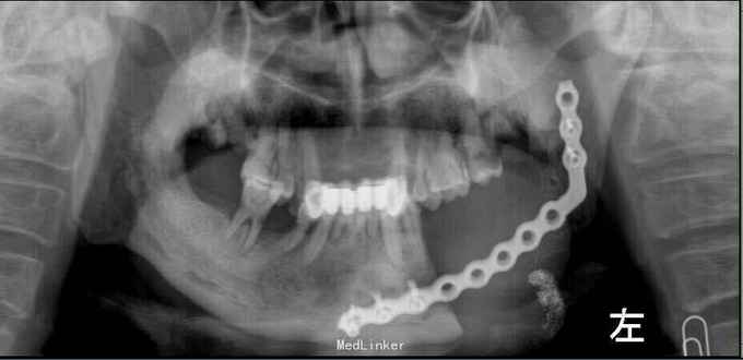 诊断:左下牙龈鳞癌伴左下颌骨、左颈淋巴转移 治疗:入院后行术前常规辅查,T99全身核素扫描结果示左下颌骨放射状性分布浓缩影,结合病史考虑肿瘤左下颌骨转移。于2012年11月20日开始用平阳霉素行术前诱导化疗;并行颈部CT增强扫描考虑有颈部淋巴结转移。12月8日化疗结束平阳总剂量达160mg;肿瘤体积缩小约30%。复查血生化、血气、胸片未见肺纤维化。为尽量达到预期治疗的目的,医生术前与患者及家属进行充分沟通,征得同意后于12月18日在全麻下为患者行'左侧改良性颈淋巴清扫术十左下牙龈癌切除术十左下颌骨阶段切除术十左下颌骨重建钛板连接朮十左胸大肌带肋骨岛状肌皮瓣转移修复术。手术历经约8h,输血800ml,术中并送切缘冰冻报告为阴性,术后于ICU复苏拔管,次日回病房行留置胃管、防感染等综合治疗。