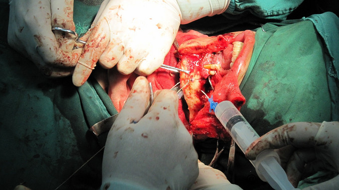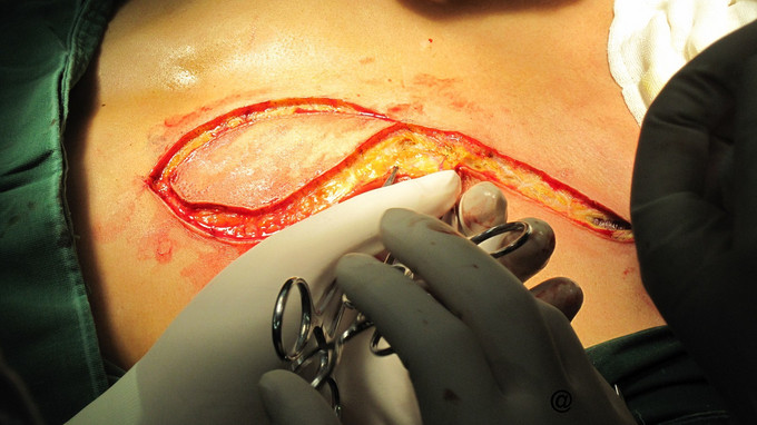 随访:术后二天,见口内皮瓣色泽正常无发黑,术后一W,见皮瓣远端裂开出现约1.0cm长口腔瘘口,经冲洗换药置碘仿沙条数次,并补充白蛋白助瘘口愈合,于术后一月出院转肿瘤科行术后化疗。并分别在三月后,半年,一年,二年,三年进行跟踪回访,未见有肿瘤复发迹象。 讨论:本病例因左颈部淋巴结考虑有转移,假如采用颈部肌皮瓣转移修复缺损区可能不安全;故采用远处肌瓣修复。颈清时切除了左胸锁乳突肌便于给胸大肌通过留下空间,避免两块肌肉重叠造成左颈雍肿。同时拮扎左颈外A以減少术中出血;取肋骨时避免损伤胸膜造成气胸,制取胸大肌岛状肌瓣时注意保留左肩峰动静脉;此乃手术成功的关键。(手术的成功,多谢原四川省肿瘤医院头颈外科陈健超主任的大力协助)
