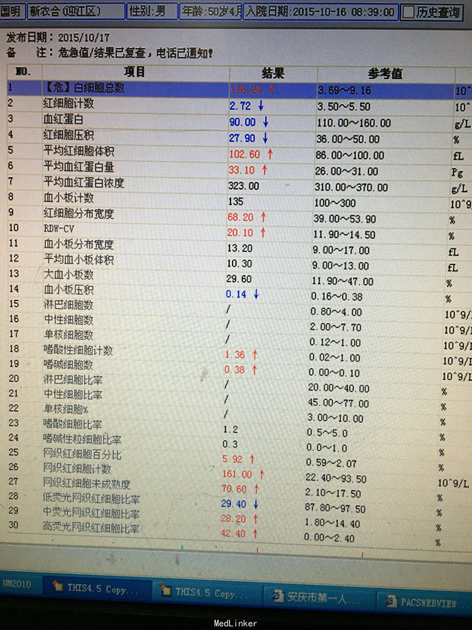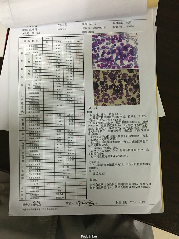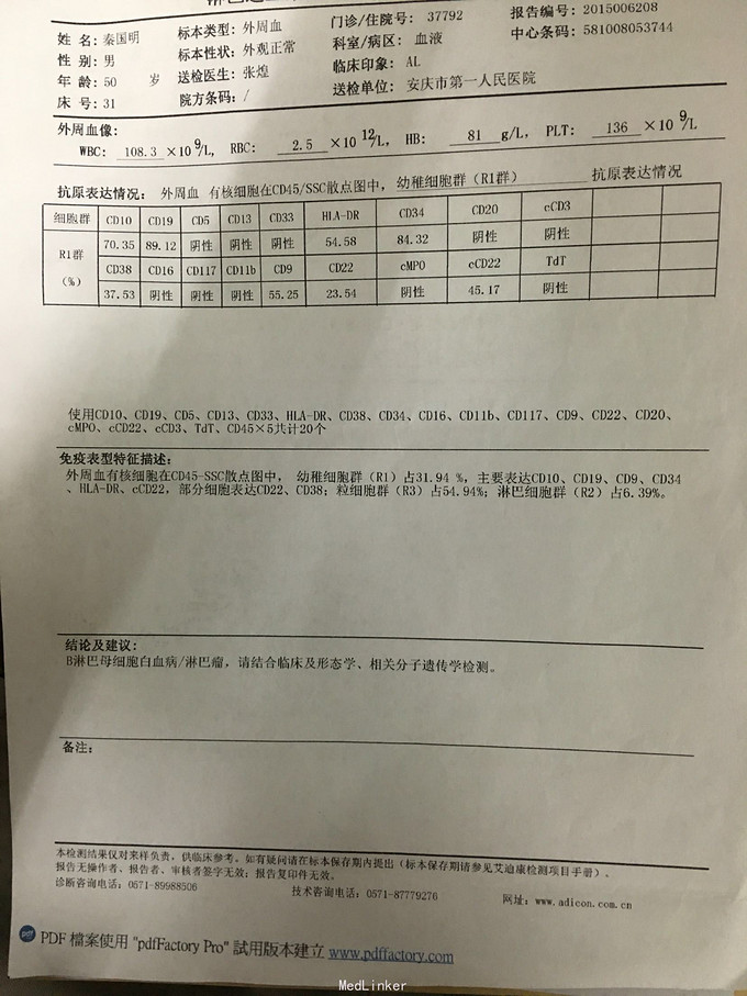 患者在肾内科发现血细胞明显升高后,请我科会诊。考虑白血病转入我科。初考虑慢性粒细胞白血病可能性大,骨髓细胞学提示急性白血病。但具体髓系淋系无法分类。白血病免疫分型提示b淋巴母细胞白血病/淋巴瘤。欲加送融合基因及染色体核型分析,但患者自动出院赴苏大一附院血液科就诊。