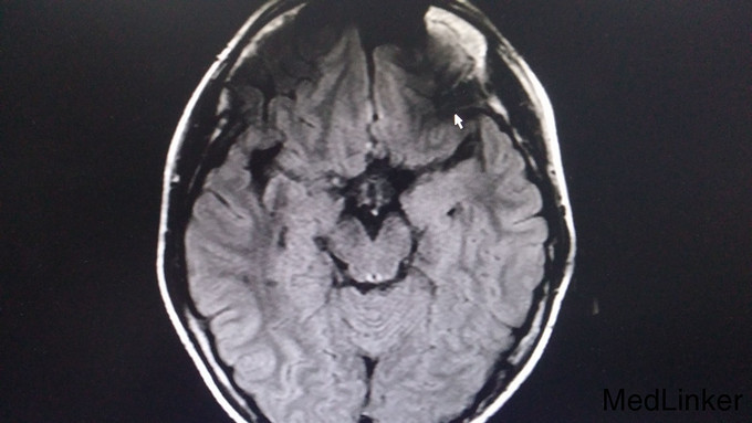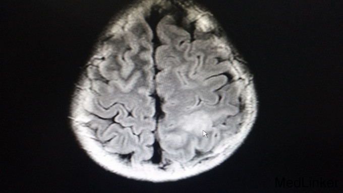 查体:脑膜刺激征阳性:Kernig征阳性,颈抵抗,颏胸距4指。辅助检查: 1. 血常规:白细胞19.02G/L,中性粒91.4%,血沉26mm/h;凝血6项纤维蛋白原4.08g/L,D-二聚体1.31mg/L;生化八项、脑脊液常规、生化、细菌、真菌未见明显异常,脑压240mmH20; 2. 脑电图:痫样放电,中度异常脑电图; 3. CT:双侧额叶纵裂旁灰质、双侧岛叶、右额叶上部及左顶叶多处灰质异常信号。 4. 外院T-spot试验阳性。
