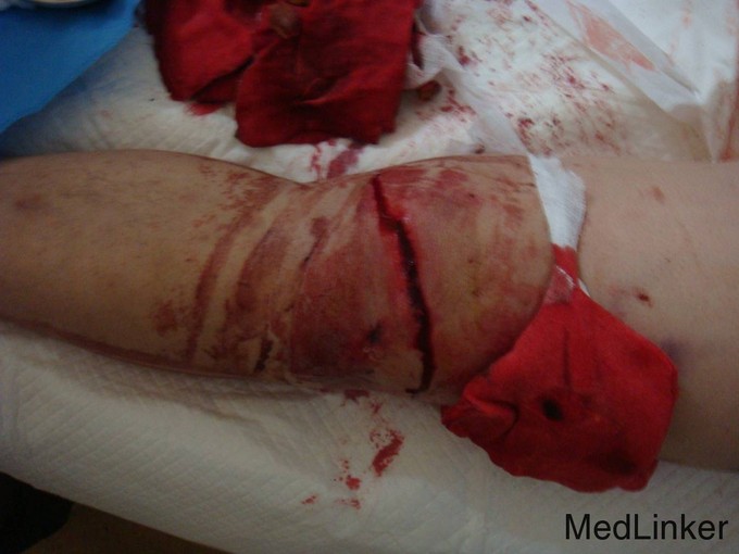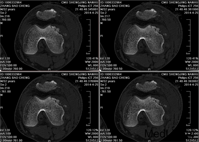 左膝见一长约10cm的开放口,压痛(+)。未触及骨擦感及异常活动,未闻及骨擦音,患肢无明显 麻木,左下肢血运良好,余肢体查体未见明显异常。