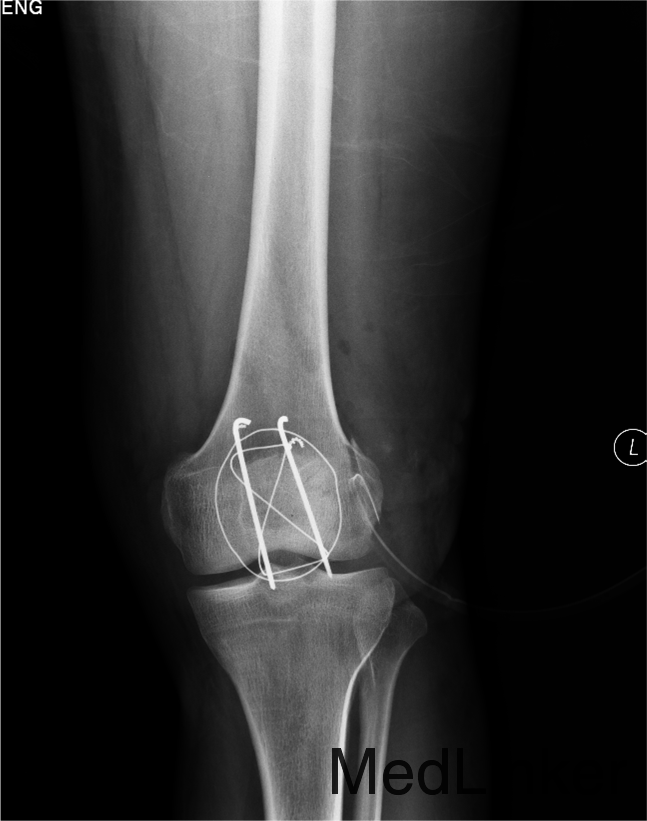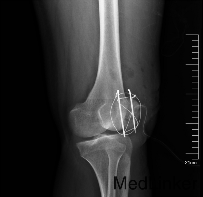 患者入院后急诊行左髌骨清创缝合术,左髌骨骨折切开复位张力带内固定术。术后局部换药无红肿渗出,冷敷,甘露醇消肿,患肢抬高。患者术后14无不良主诉给予拆线。