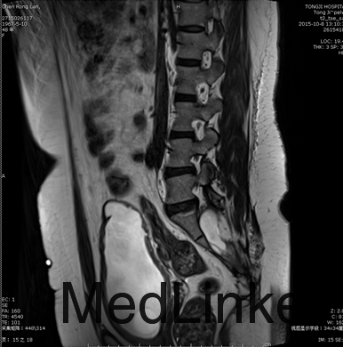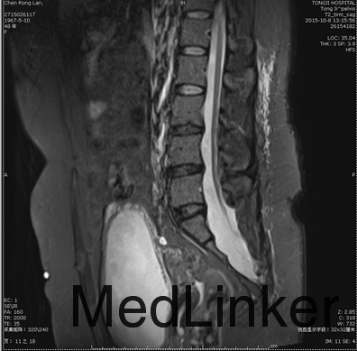 查体:体温36.4℃脉搏80次/分(规则)呼吸19次/分(规则),血压138/80mmHg,双肾区无叩击痛,双下肢无水肿,外生殖器无见明显异常。 辅助检查:2015-10-03尿常规:红细胞(隐血)1+ 白细胞(粒)1+尿蛋白2+白细胞计数45.0/ul; 2015-09-30彩超示:左肾体积缩小,尿潴留。发病以来精神尚可,小便如上述,大便干燥,体重无明显改变。 尿动力学检查示:膀胱收缩乏力(神经源性);膀胱感觉迟钝,残余尿增多;建议行间歇导尿治疗。 骶丛神经MRI平扫及功能成像:1、盲囊囊性扩张, 骶尾骨发育不良;2、脊髓圆锥下移(S1下缘水平),脊髓栓系可;3、右侧S3、4神经根显示欠清,右侧S2、左侧S2、3、4神经根显示纤细;4、宫颈纳氏腺囊肿;5、膀胱异常改变,考虑为神经源性膀胱;6、L4/5、L5/S1椎间盘膨出,双侧L4、5神经根受推移。