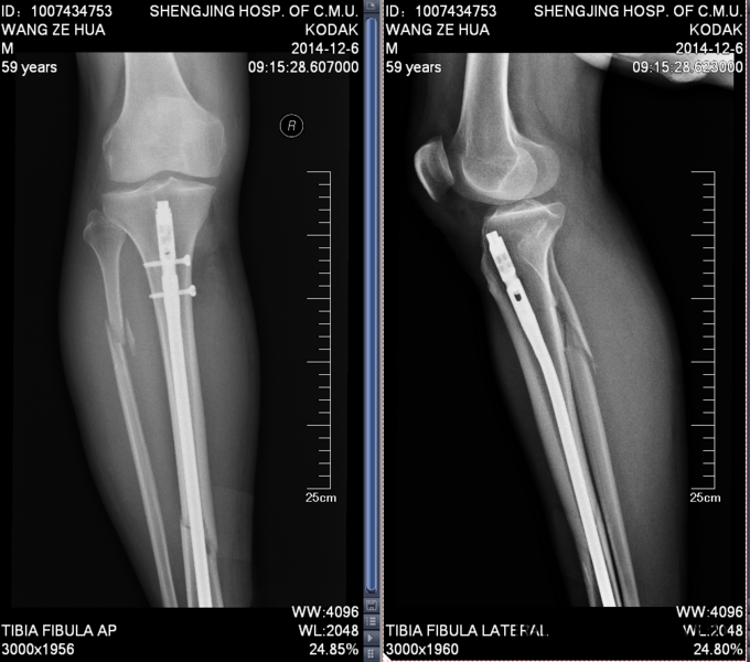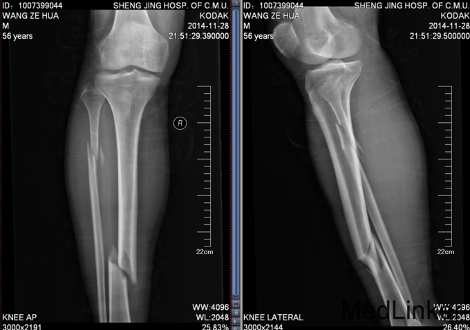 患者2014年11月28日晚上20时自己走路不慎掉入沟中,伤及右小腿,伤后自觉右小腿疼痛明显,肿胀,畸形,遂急诊来中国医科大学盛京医院急诊外科就诊,行右胫腓骨正侧位,提示右胫腓骨骨折,患者为求进一步治疗来我科就诊,急诊以“右胫腓骨骨折”为诊断收入院