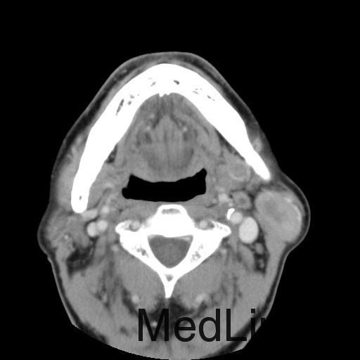 患者:男,64岁。 主诉:左耳垂下肿物1年余 病史:患者1年余前发现左耳垂下肿物,逐渐增大,与进食无关,无疼痛、麻木感,未予治疗。 体查:左右颜面部基本对称,双侧上、下颌骨未及明显异常膨隆,左耳垂下腮腺区见一膨隆肿物,大小约为4cm×3cm,边界欠清,质软,表面皮肤无红肿、破溃、出血,无触痛,皮温正常,活动度可。 辅助检查:无