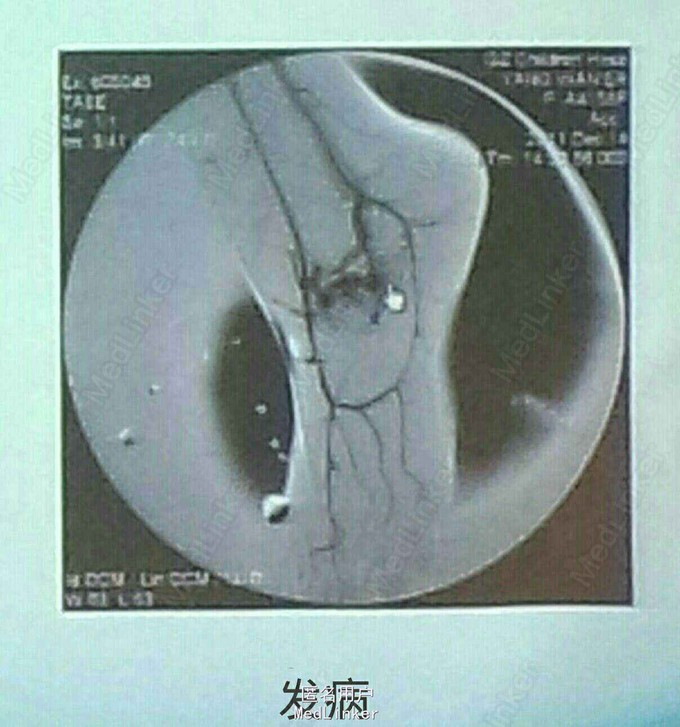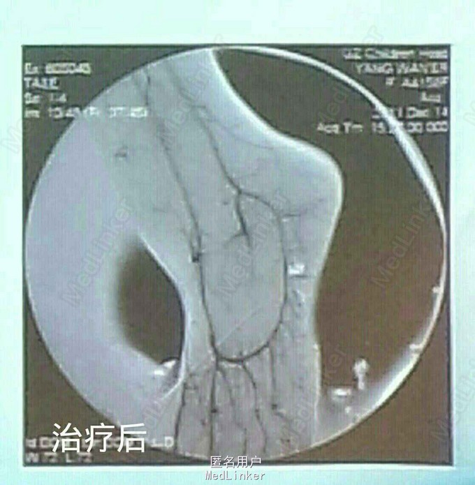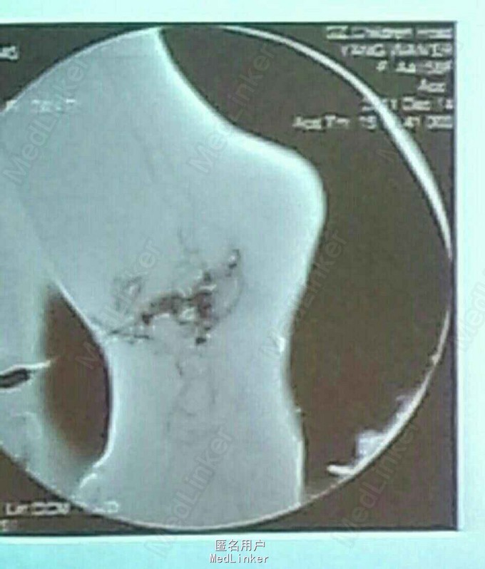 诊断:足部动静脉畸形 治疗:介入下造影,明确后于畸形处注射外科胶。再次造影动静脉畸形处未见造影剂。