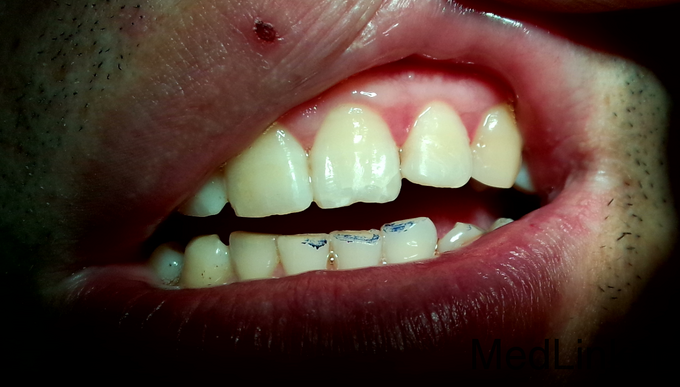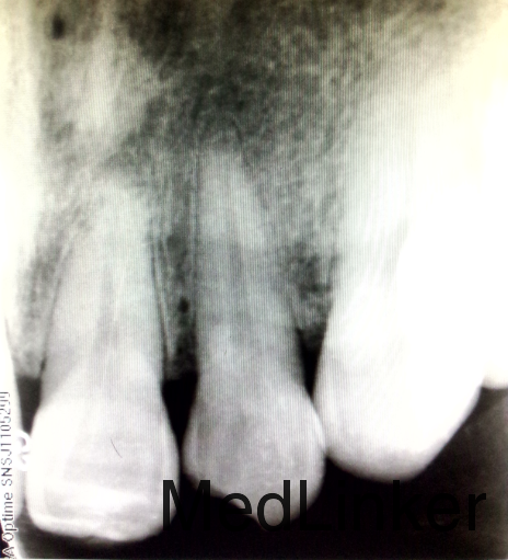 检查:#22近中切角崩缺,未露髓,探-,扣-,松-。邻牙未见明显牙体折断。牙龈稍红,探诊出血。X线示:#22近中切角缺损,未及髓。#21及#22根尖周可见弥散密度减低区。电测示:#21及#22活力存。