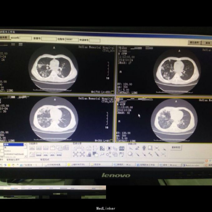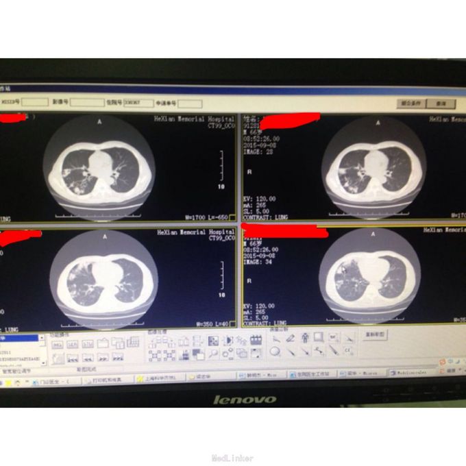 现病史:患者,男,65岁,因“咳嗽咳痰消瘦1月余,加重伴气促3天收入本区。患者于1月余前出现咳嗽,多为连续性刺激性咳嗽,昼夜不分,咳少量黄白色粘痰,痰能咳出,同时伴消瘦,体重下降约15斤,患者在当地医院及本院就诊,查血糖明显升高,予二甲双胍及阿卡波糖控制血糖,血糖控制欠佳,且咳嗽无明显减轻。3天前咳嗽明显加重,咳黄色粘稠痰,痰难以咳出,同时伴胸闷气促,活动时加重,休息后稍减轻,为进一步明确诊断及治疗,在本院继续就诊,查双肺CT:1、双肺继发型肺结核并右肺上、下叶及左肺上叶尖后段多发空洞形成,并支气管播散,建议治疗后复查。2、气管隆突下淋巴结肿大。门诊收入本区进一步治疗。