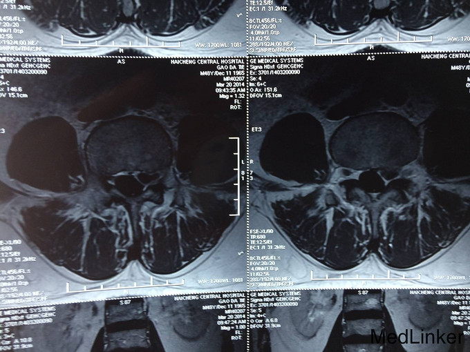 专科查体:患者跛行入病房,腰椎正常生理曲线减小,腰部无明显压痛及叩击痛,髂腰肌肌力(L5,R5),股四头肌肌力(L5,R5),足趾背伸肌力(L5,R5),跖屈肌力(L5,R5),肌张力未及明显异常。直腿抬高试验(L,50°),加强试验阴性,健腿抬高试验阴性,PSR(L++,R++),ASR(L++,R++),Babinski'sign(L-,R-),双侧足背动脉搏动正常。