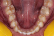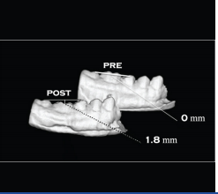 考虑到美观、舒适度、治疗时间,计划在下颌第一磨牙颊舌侧植入微型种植体,配合弹簧矫正下颌第一磨牙。前后治疗时间为45天。45天后三维扫描分析软件分析矫正情况,以邻近第二磨牙近中颊尖和第二前磨牙颊尖连线为基准,下颌第一磨牙颌面已压低1.8mm;以第二磨牙和第二前磨牙颊舌尖连线为基准,下颌第一磨牙颊向移动2.3mm。