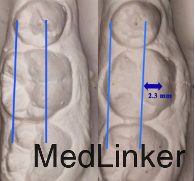 检查发现右上颌第一磨牙缺失,右下颌第一磨牙伸长并舌倾,上颌垂直向修复空间不足。