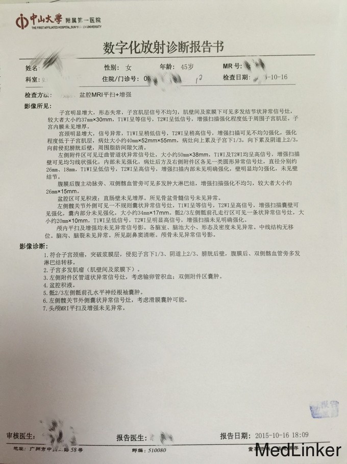 患者45岁,2个月前开始出现同房后出血,伴尿频、尿急、尿痛,伴轻度尿不尽感,无排尿困难,无尿失禁,无血尿,有肛门坠胀感,无腹痛、腹胀,无阴道流液,无发热、乏力等不适,于当地医院B超提示子宫肌瘤。9天前再次当地医院就诊,行宫颈活检,考虑宫颈恶性肿瘤。遂来我院就诊,入院。起病以来,患者无腹痛、腹胀,无阴道流液,无发热、乏力,精神、胃纳、睡眠可,体重近3个月下降3.5kg。患者务农,G1P1A0,1990年顺产1儿,体健。