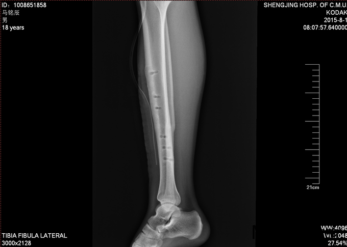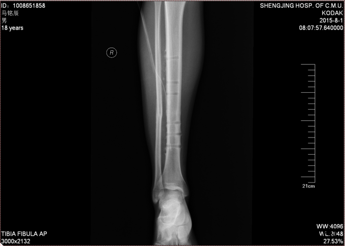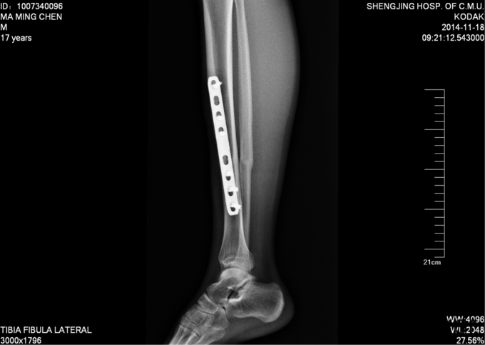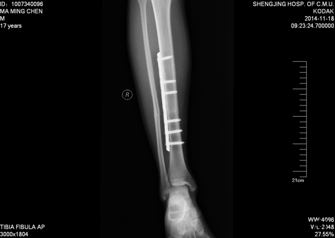 现病史:患者及家属自诉于2013年11月9日下午2点因打篮球摔伤致右小腿疼痛、肿胀,后于2013年11月11号于我院行胫腓骨骨折切开复位内固定术,现内固定物固定已一年半来我科继续治疗。病来无发烧发热,无咳嗽,无其他不良主诉,饮食二便正常,体重近期无明显变化。