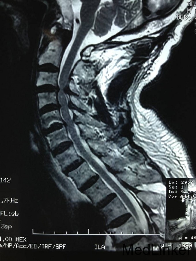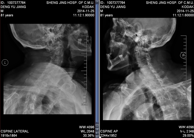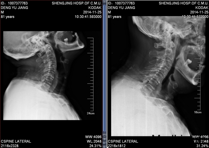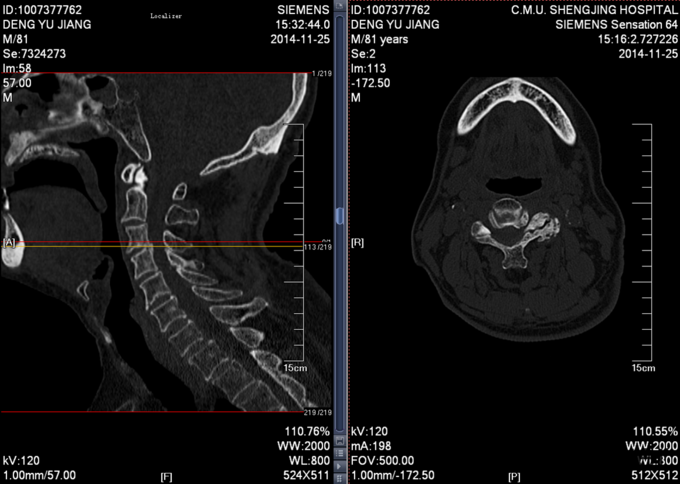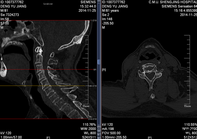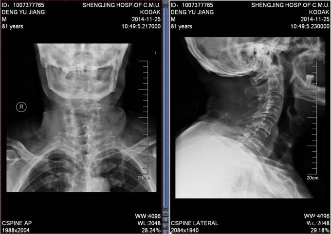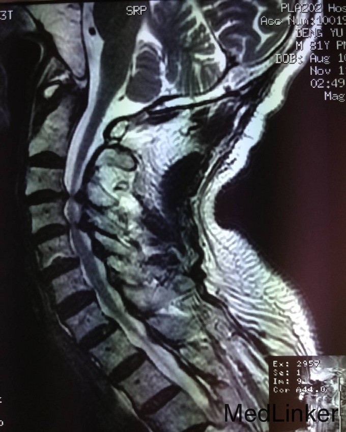 患者男,81岁,自述于1个月前出现双上肢感觉减退,发胀,以左侧为重,后来加重,左侧握力减退,于201医院就诊,行颈椎MR检查,提示为颈3-4、4-5间盘突出,为求进一步治疗就诊于我院,患者病来饮食、睡眠佳。大小便正常,体重无明显变化。
