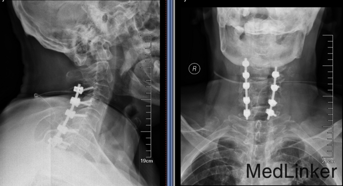 诊断:颈椎病,颈椎间突出,高血压病 患者入院后完善相关检查,请相关科室及麻醉科会诊,医院医务部审批后,查无其他手术禁忌症,于全麻下行颈椎后路单开门椎管扩大减压侧块螺钉内固定术。术后给予患肢雾化祛痰,抗炎,消肿,营养神经,接骨等对症治疗。术后患者在颈领的保护下可下地行走,术后14天拆线后予以出院,