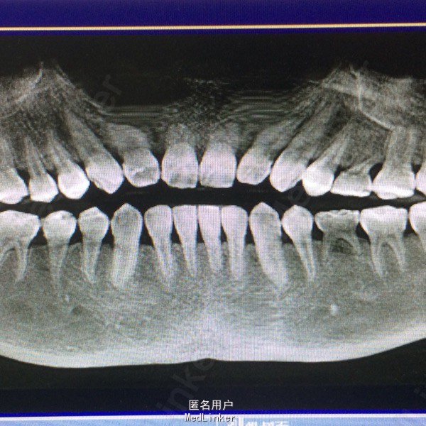 检查:18.28.38.48牙齿阻生,牙龈无红肿,65.75乳牙形态,冷(-),扣痛(-),不松,龈(-), 全口曲面断层片示:18,28.38.48牙齿阻生,根尖周未见明显异常,65.75乳牙,牙根不同程度吸收,25.35先天缺失 全口咬合关系基本正常