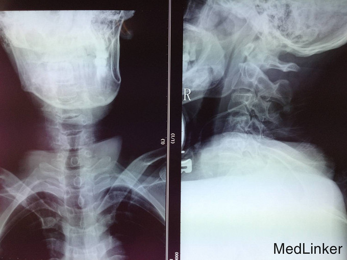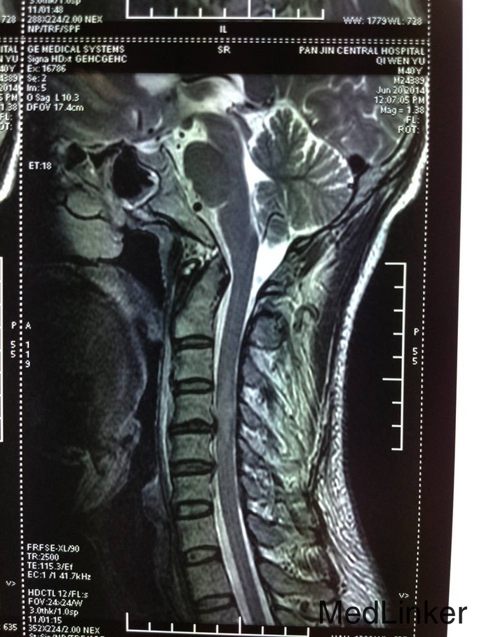 患者于2014-06-18日16:00点左右从3米处坠落,前胸着地,致颈部疼痛,四肢活动受限,受伤后被家人送入当地医院,行X线检查,颈椎MR检查,提示为颈椎损伤。患者及家属为求系统治疗,急来我院;急诊以“颈椎外伤”为主诊断收入我科。病来患者一般状态无头晕及头痛,无咳嗽咳痰,无恶心及呕吐 ,饮食可,留置导尿,大便未排,近期体重无明显改变。