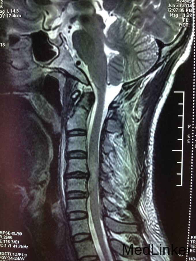 患者颈椎外伤不全瘫,应及早的行手术治疗,完善检查后可见MR的脊髓有高信号,应早期减除压迫,恢复神经功能。