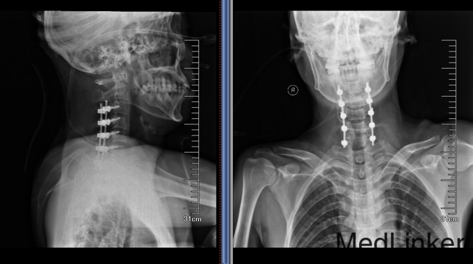 诊断:颈椎外伤(不全瘫);脊髓损伤 患者入院后完善相关检查,查无手术禁忌症后急诊行颈椎后路椎板减压椎管扩大单开门侧块螺钉内固定术,术后患者生命体征平稳,双上肢感觉疼痛,双下肢足趾肌力恢复到1级,术后3天后转入康复科继续康复治疗。