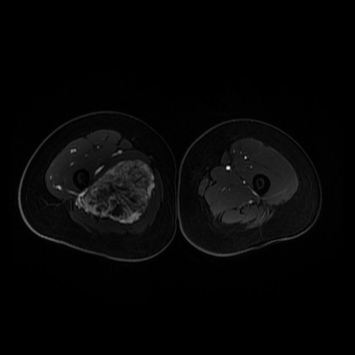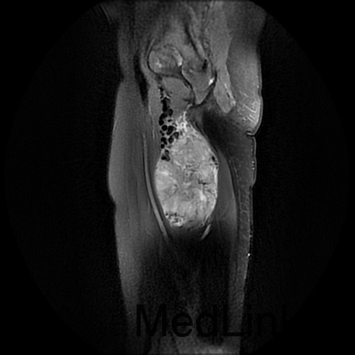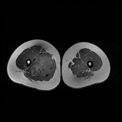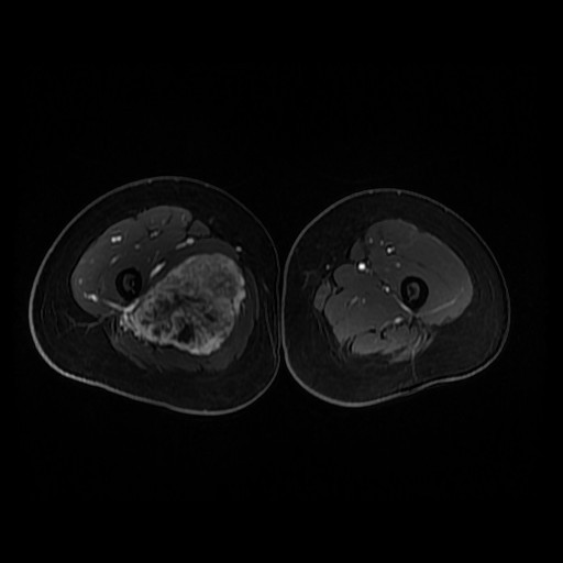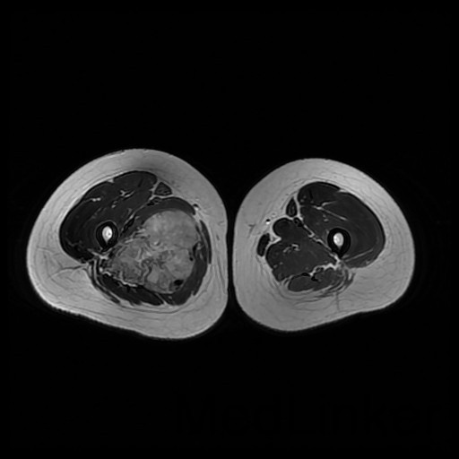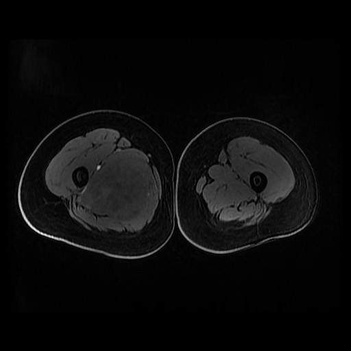 查体:右大腿上段较左侧增粗,后内侧皮下可触及大小约5*6cm肿物,质软,边界不清,活动度可,压痛(+),无波动感。 辅助检查:胸部CT:双肺多发转移瘤。