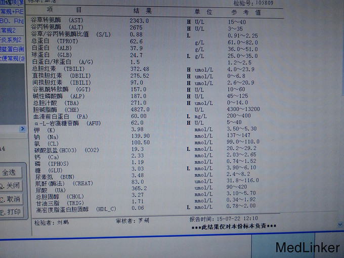 患者经过治疗后,患者谷草降至110,谷丙134,总胆400,直胆308,凝血PT22.5s,PTA40,患者转氨酶下降明显,肝细胞炎症得到有效控制。但黄疸仍在上升,此时治疗关键不在于降酶,而在于控制黄疸,避免其黄疸继续上升。 继续当前治疗,必要时可行人工肝或者干细胞治疗。