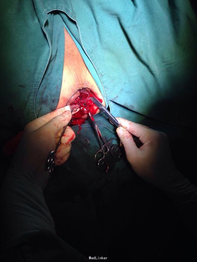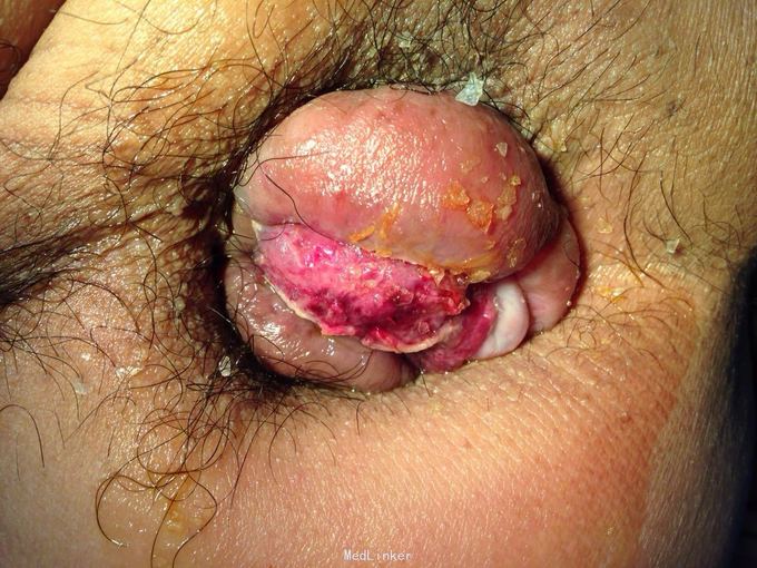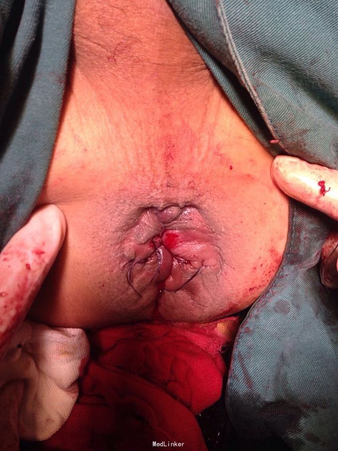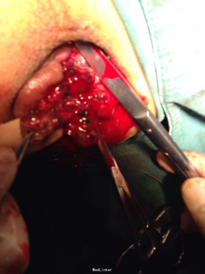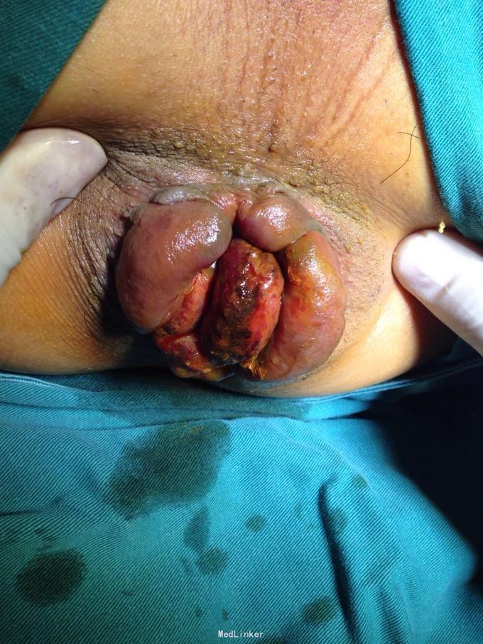 肛门居中,结石位肛缘呈环状外翻脱出,充血水肿,暗紫色,皮下可见血栓形成,质软压痛,向上延及齿线以上,齿线沟消失,黏膜隆起,左侧黏膜脱出外翻,糜烂出血。直肠黏膜松弛脱垂,皱褶明显,括约肌紧张,指套染鲜血,在手指所达处未发现其它异常。 辅检:血常规:HGB 90g/L,余正常。生化:正常;凝血酶:正常;DR:骨关节退行变。