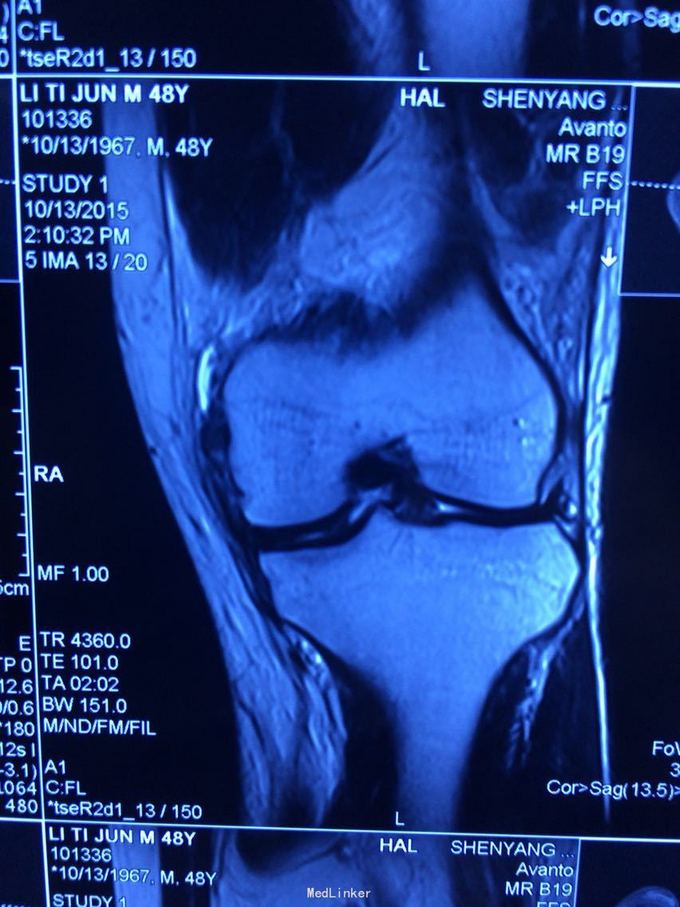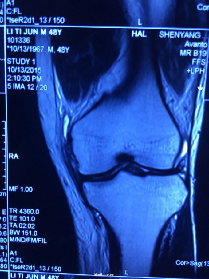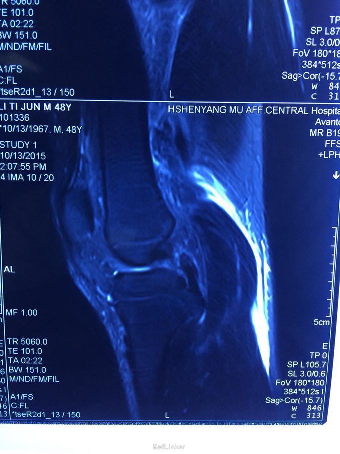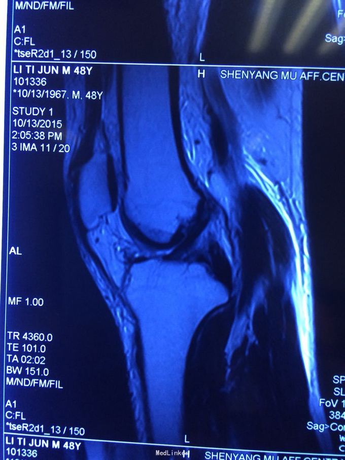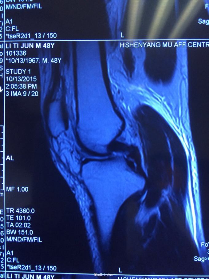 诊断:膝关节多发韧带损伤,后交叉韧带、内侧副韧带 处理:给予关节镜下后交叉韧带重建,小切口修补内侧副韧带,取自体半腱股薄肌腱