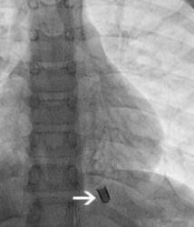 鉴于异物所处的部位过深,单独应用肺部介入技术取出异物难度过大,便决定联合心脏介入技术进行治疗。全麻并插入6.5mm的支气管导管。将2.8mm的支气管镜连接双轴旋转接头,在透视介导下,探查左主支气管直至不能深入。此时支气管镜距离异物仍有几毫米。撤出纤维支气管镜后,将4-Fr的Terumo指引导管和0.018英寸的Hi-Torque Flex-T导丝通过旋转接头送入。在透视介导下,导管很容送到了异物周围。之后将导管替换为6-Fr JR-4的大口径指引导管。