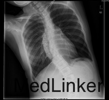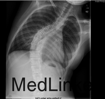 查体:胸段脊柱向右侧凸,右侧胸廓后部凸起,剃刀背畸形,剃刀背高度2cm,右肩高,骨盆略向右倾斜,四肢及关节未见异常,未查见牛奶咖啡斑。脊柱各棘突及棘突旁无压痛及扣痛。胸腰部前屈、后伸及侧屈、侧旋范围正常,双下肢等长,未发现感觉减退区,四肢肌力5级,生理反射均正常引出,病理反射未引出。 辅查:X片示胸段脊柱以胸8为中心明显右侧弯畸形,胸段上段及腰段相应轻度左突侧弯。