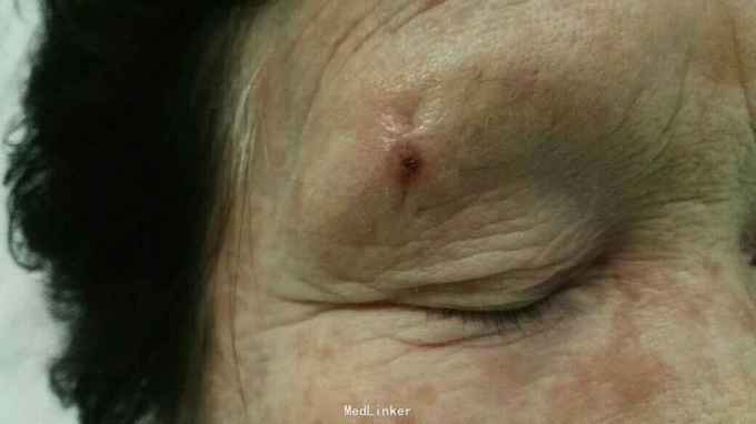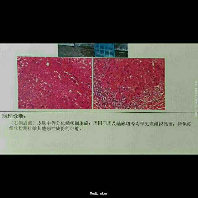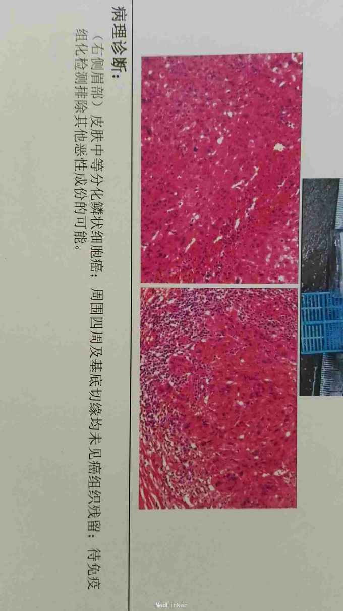 患者女,70岁,右眉部肿物1年,术后再发3个月。患者1年前在右眉毛处出现溃疡,持续不愈合下在当地医院行浅表肿物切除术,病理示:鳞状细胞癌,肿瘤边缘紧邻切缘。主诊医生建议二次手术扩大切除范围,患者未同意。3个月前手术疤痕处出现小溃疡,逐渐扩大,易出血,右侧眉毛逐渐脱落。