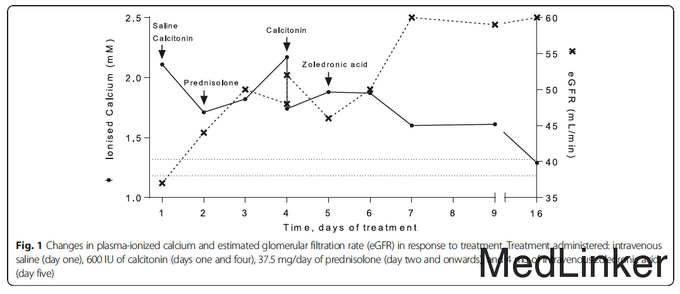 诊断:高钙血症 GIST复发 治疗:处理高钙血症予以降钙素、泼尼松及唑来膦酸,血钙逐渐降低,但仍未恢复正常。随后至肿瘤科,开始口服伊马替尼治疗,一周后血钙方才恢复正常,2周后骨化三醇水平亦降低,8周后复查CT显示肝脏病灶显著缩小,血钙水平也维持正常水平。