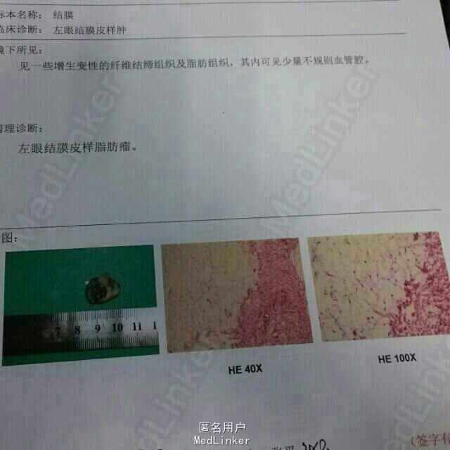 诊断:左眼结膜肿物 治疗:左眼结膜肿物切除术+眶膜肿物切除+自体结膜瓣移植术 病理结果:左眼结膜皮样脂肪瘤