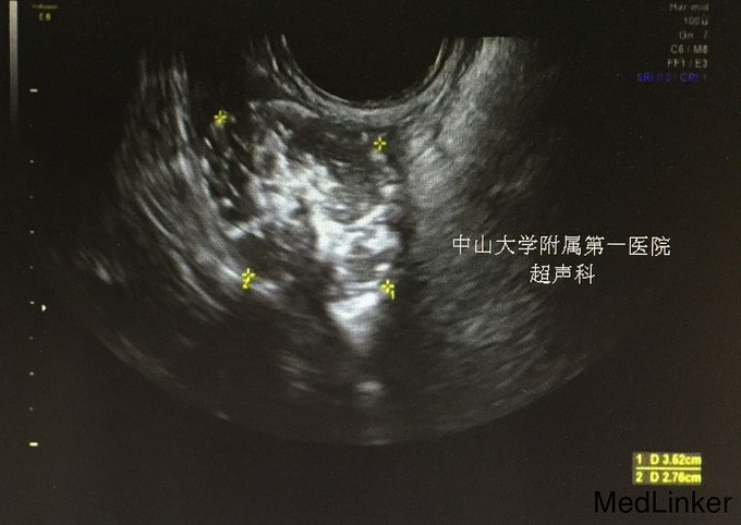 随访:缺 讨论:患者有初潮始就月经失调,以无月经来潮为主,查体乳腺发育稍差,外阴可见阴蒂肥大,呈龟头状,未见开口,可见阴道及尿道开口,盆腔右侧可及包块,B超提示双侧两性母细胞瘤可能,染色体提示46XY,t(4;20)(q27;p13),诊断“两性畸形”成立。本例重点在于如何治疗,患者尚14岁,若术中可辨认两性性腺界限,可考虑先行局部活检,待冰冻病理结果回报,若可区别卵巢与睾丸成分且无恶性病变,则术中予剥离睾丸组织;若无双侧附件为两性性腺嵌合体难以剥离,则切除双侧附件肿块,术后终止激素替代治疗。若冰冻病理回报恶性,应扩大手术切除范围。