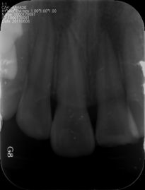 检查:21牙冠缺损,断面见护髓材料,牙冠色暗,探诊不敏感,叩痛(+++),IO松动,唇侧根方可扪及脓肿,扪痛明显,有波动感,未见瘘管,冷测迟钝 X线片见21牙根完整,见根尖周低密度影,边界不清 21,22牙冠完整,叩痛(+),I松动,牙龈未见明显异常,冷测正常