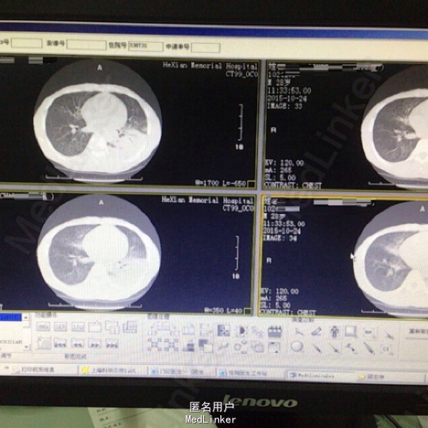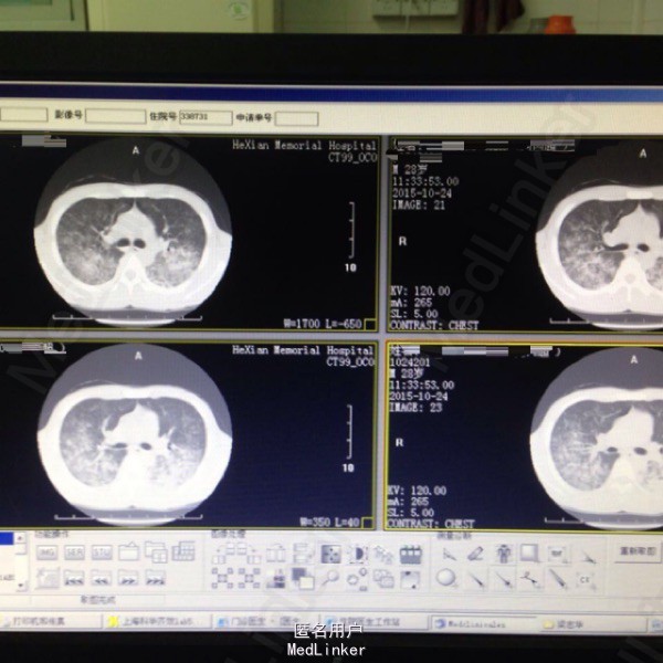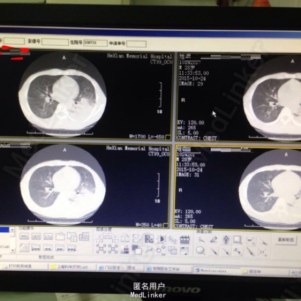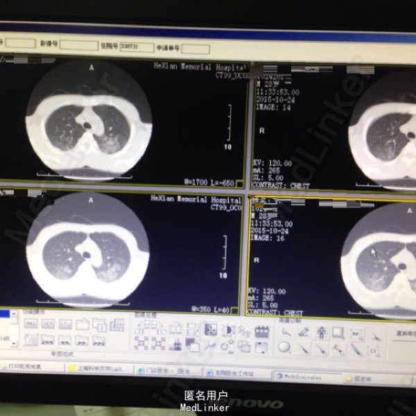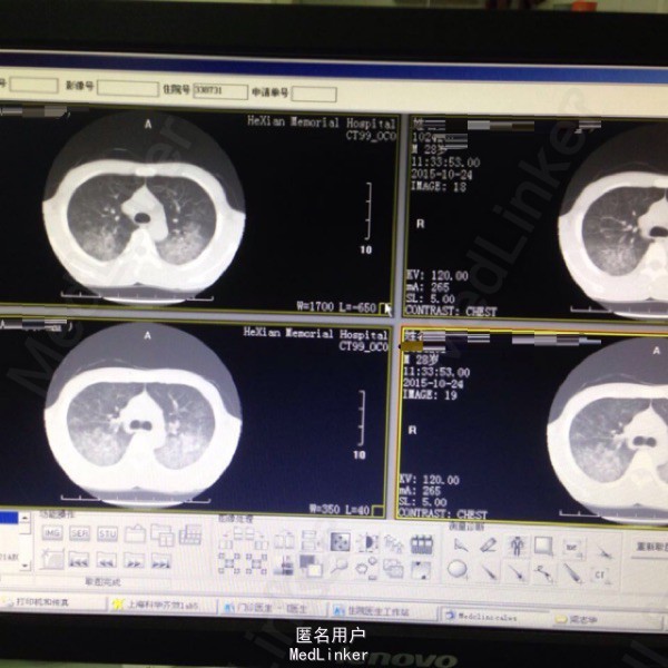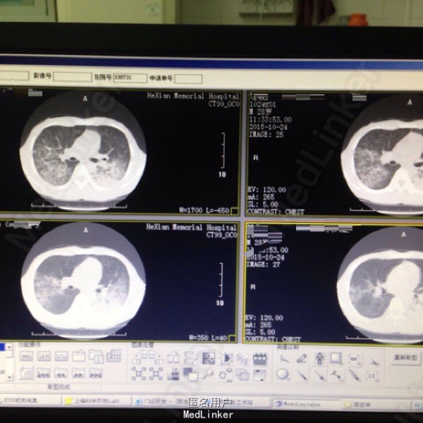 现病史:患者,男,28岁,因“咳嗽、咳痰、低热1月”于2015-10-24 09:31收入本区。患者于1月前无明显诱因出现咳嗽,为阵发性连声咳,伴咳黄痰,量一般,尚可咳出,伴低热,多于傍晚出现,具体体温未测,无畏寒、盗汗,于咳嗽及深呼吸时有两侧胸部疼痛,程度一般,无放射至其他部位,患者曾至当地医院门诊就诊,查胸片提示双肺感染,予哌拉西林舒巴坦及头孢呋辛抗感染1周,症状未明显改善,遂至我院门诊就诊,复查胸片示双肺感染病灶较前稍吸收,现拟“肺部感染”收入我科进一步诊治。