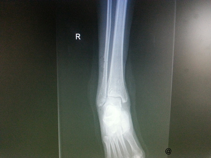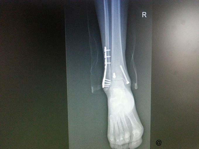 诊断:取除骨折内固定装置(右三踝骨折术后) 处理:右踝关节骨折术后取内固定术