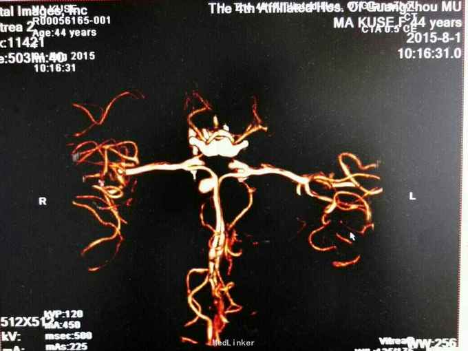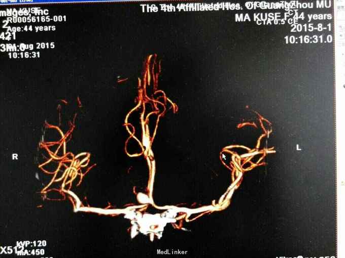 住院两个多月,因经济原因自动出院,出院时呈浅昏迷状态,GCS评分为8分。4级动脉瘤预后均较差,特别是合并广泛蛛网膜下腔出血及脑室铸形者,本病例入院后第八天在甘露醇脱水、尼膜同扩血管及脑室引流存在情况下仍出现脑肿脹脑疝,考虑为动脉瘤破裂出血后急性脑血管痉挛和脑水肿两个因素叠加引起,须引起注意。