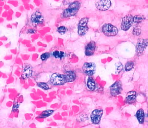 体格检查:系统检查未见异常。皮肤科检查:颈后部可见0.8 cm×1.5 cm圆形肿块,表面凹凸不平,乳头状,边缘清楚,质软呈暗紫红色,无脓痂,无脓性分泌物及鳞屑。实验室及辅助检查:无明显异常。皮损组织病理检查:表皮变薄,局灶坏死有核尘并见中性粒细胞浸润。真皮内大量新生毛细血管,部分扩张充血。内皮细胞肿胀增生,核分裂象多见,间质水肿伴有淋巴细胞为主的炎性细胞浸润,部分区域纤维组织增生。组织病理PAS染色未发现真菌。
