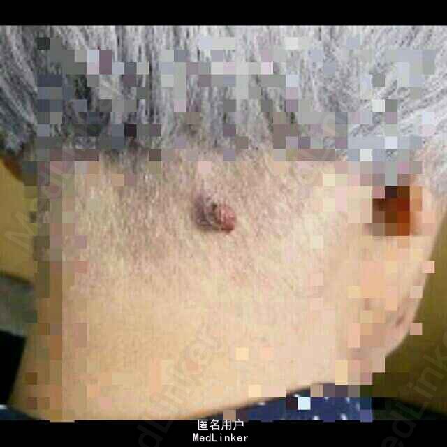 患者女,83岁。因颈部紫红色肿物3个月,易出血前来就诊就诊。3个月余前患者颈后部无明显诱因出现一绿豆大肿物,逐渐增至蚕豆大,无痛痒感。当地医院给予头孢呋辛静脉滴注,皮损无好转。既往无其他疾病史记载,否认婚外性接触史。