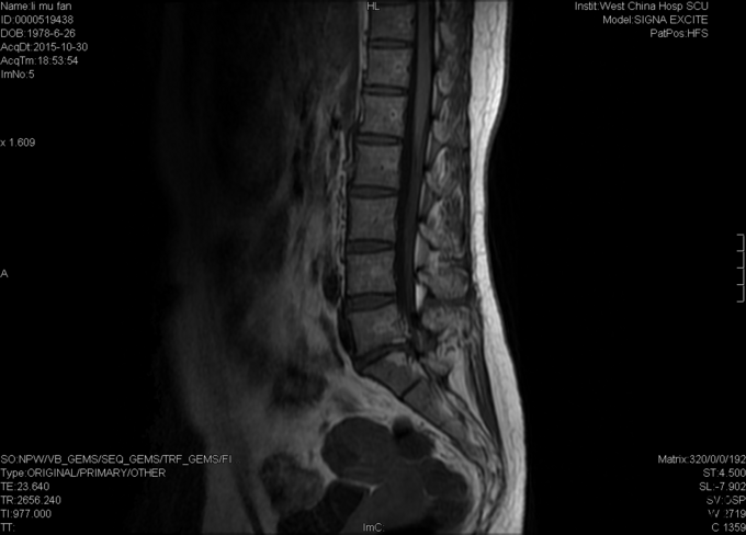 女,37岁4月,因“反复腰痛伴左下肢疼痛20+年,加重1+月”入院。20+年前患者因跌倒都出现腰部疼痛,症状反复发作,偶伴左小腿疼痛,予以牵引、针灸、按摩等治疗后症状缓解,久坐后复发。1+月前再次出现腰部及臀部疼痛,于当地医院予以对症支持后症状未完全缓解,现为求进一步治疗,遂入我院就诊。