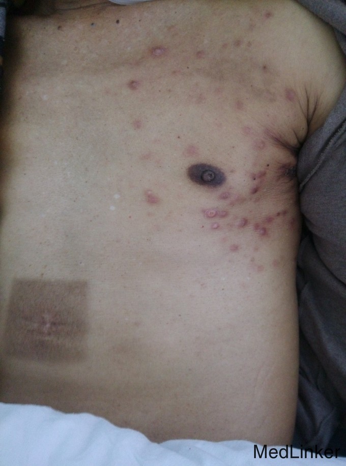 患者,男,57 岁, 主诉:下腹部肿块切除4个月,双侧腋窝肿块、全身浮肿2个月 现病史:患者2014年4月发现下腹部包块,进行性增大,仅2月时间就从3CM增大至6CM, 2014年6月在当地卫生院就诊,行肿块切术手术,术后病检示"(腹壁)汗腺癌"。湖北省肿瘤医院病理切片会诊结论"(腹壁)汗腺癌"。给与腹壁包块手术野瘤床区放疗27次,54GY,放疗于2014年8月上旬结束。其间患者出现间断发热,体温38~39℃,干咳,有少许白痰,同时发现上胸部出现散在无痛红色的结节,进行性增大;,到多家医院就诊给与对症处理,症状无缓解,又出现双侧腋窩肿块,间断黑便,并出现全身浮肿,遂来我院就诊。起病以来精神食欲差,大便正常,小便黄。既往史、家族史无特殊。