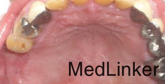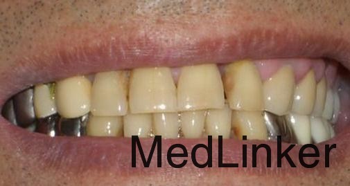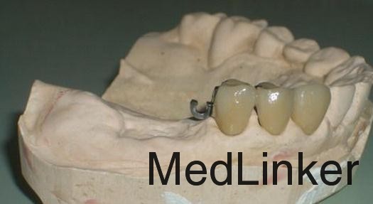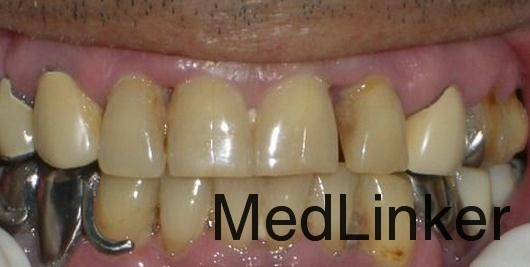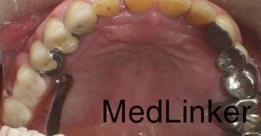 左上后第一第二磨牙缺失1年,牙槽骨吸收较多,有明显凹陷,第二前磨牙尚健康,第一前磨牙近中龋坏金属嵌体,尖牙多年前烤瓷冠修复,边缘欠密合,色泽有较大差异。咬合关系尚可。