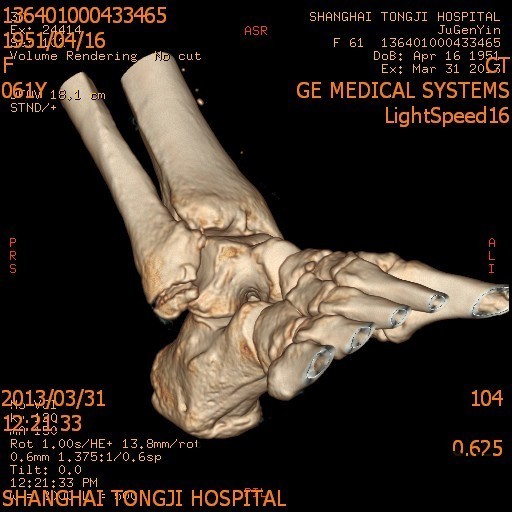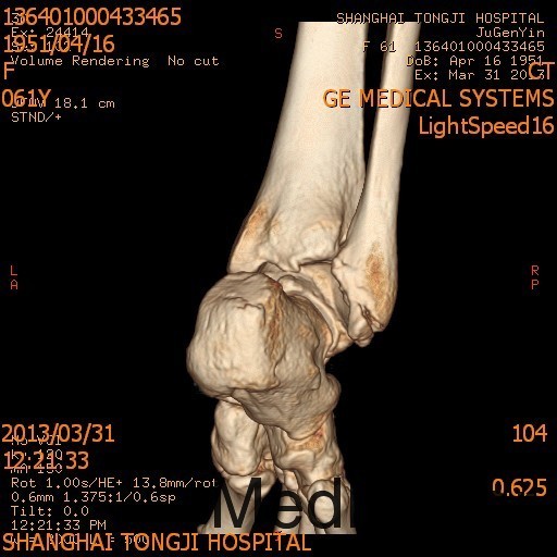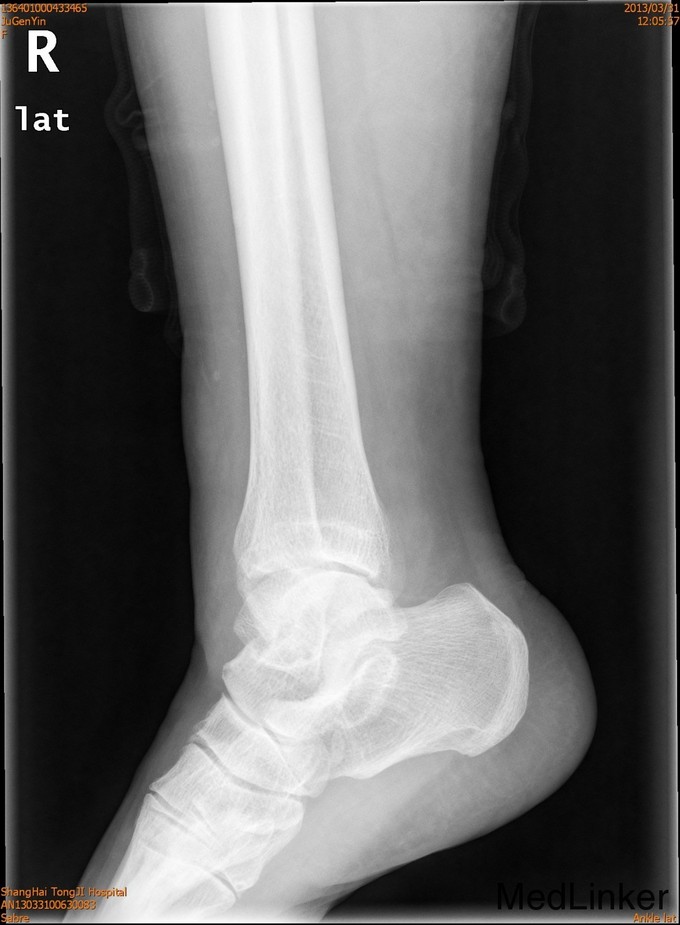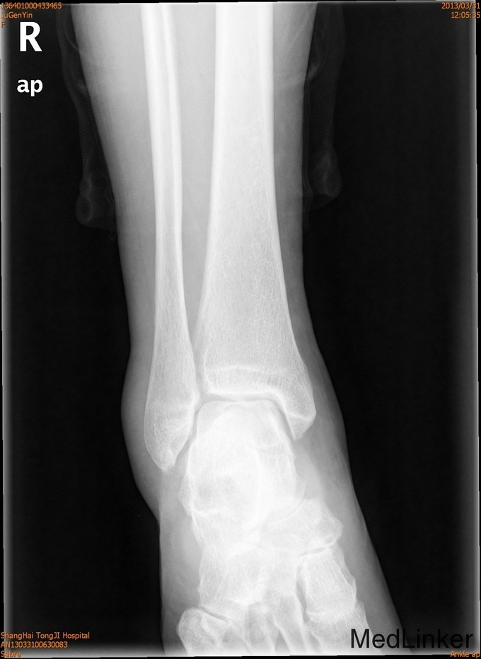 患者女,61岁,摔伤后右踝足肿痛4天。患者4天前不慎摔伤,即感右足踝疼痛,肿胀,活动受限 ,休息后疼痛减轻,X线示右外踝骨折。