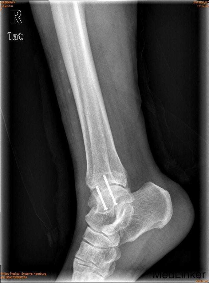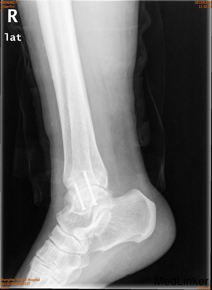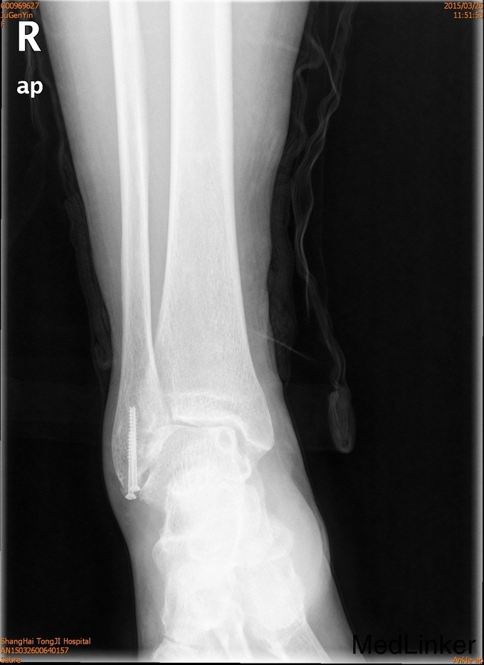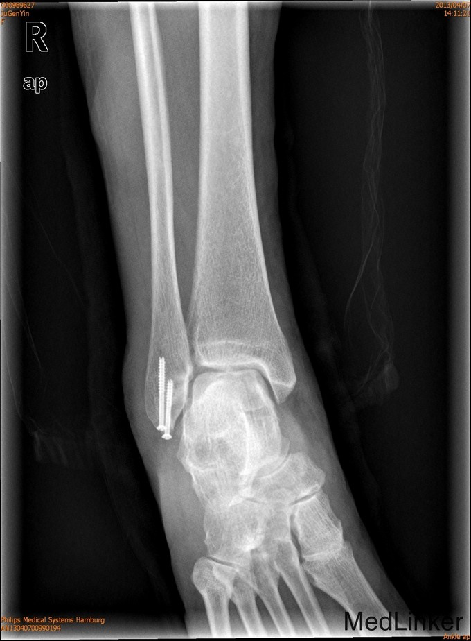 2年后随访患者活动可,内固定位置可,螺钉未予取出。外踝骨折可导致踝关节不稳定,手术治疗效果可。