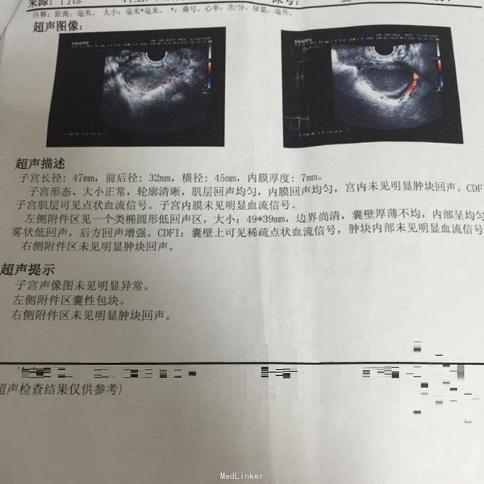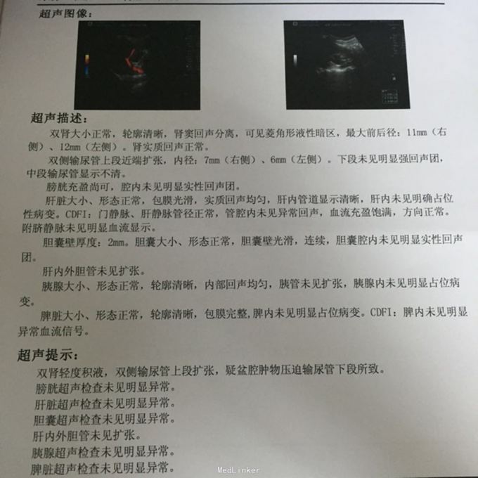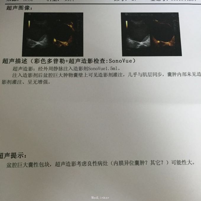 入院查体:子宫右后方可扪及一巨大囊性包块,15*10cm,边界清,活动度欠佳,无压痛、反跳痛。入院后查CA125 210U/ml复查彩超:子宫后方巨大混合性包块,大小约134*129*122mm,内部呈均匀云雾状低回声,并见附壁低回声团(大小73*20mm),后方回声增强,超声造影:考虑良性病灶(内膜异位囊肿?其他?),彩超泌尿系:双肾轻度积液,双侧输尿管上段扩张,疑盆腔肿物压迫输尿管下段所致。