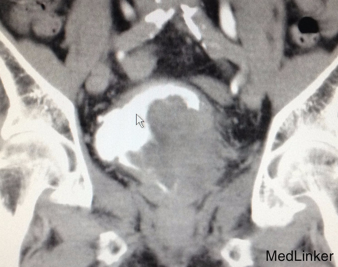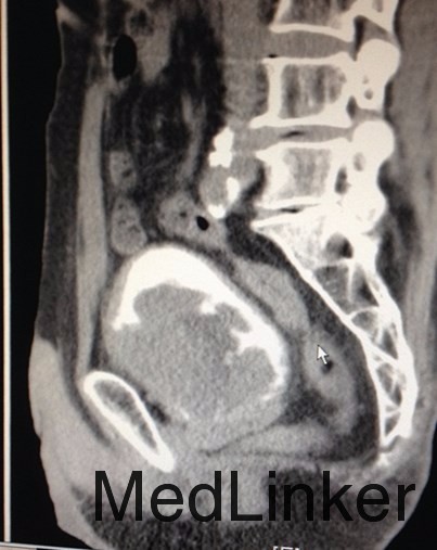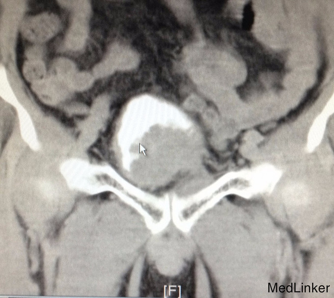 主诉:前列腺癌术后10月余,反复肉眼血尿6月 病史:老年男性,10月余前因进行性排尿困难到当地医院就诊,拟诊为前列腺增生,行TURP,术后病理提示前列腺组织内见高级别尿路上皮癌浸润,后予双侧睾丸切除术去势治疗,术后恢复良好出院。6月前患者无明显诱因反复出现全程肉眼血尿,淡红色,并伴尿痛、排尿困难,未见血块,无伴畏寒发热,无腹痛腰痛等不适。当地医院就诊,诊断“尿道结石”,予行尿道结石钳出+膀胱镜检+尿道扩张术。出院后患者仍反复血尿,性质同前。遂至我院门诊就诊,行腹部CT见:膀胱肿瘤。收入院治疗。
