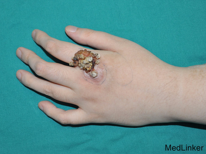 查体:左手背食指末节指骨上方见直径约2.5cm*4cm大小皮肤新生物,表面凹凸不平,有污秽分泌物,突出体表约1cm。 辅检:未见明确手术禁忌症。