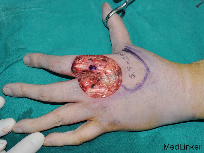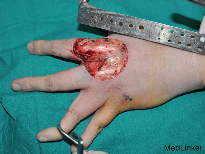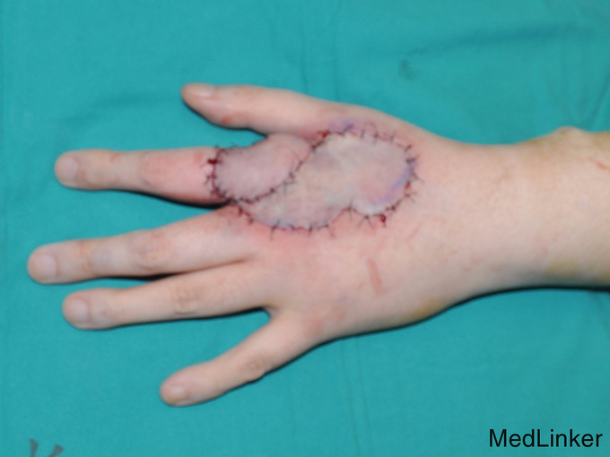 诊断:术中冰冻提示“左手背皮肤乳头状肿瘤” 治疗:予扩大切除后见3cm*5cm创面,肌腱外露;临近部位设计皮瓣修复肌腱外露区域,供瓣区植皮修复。