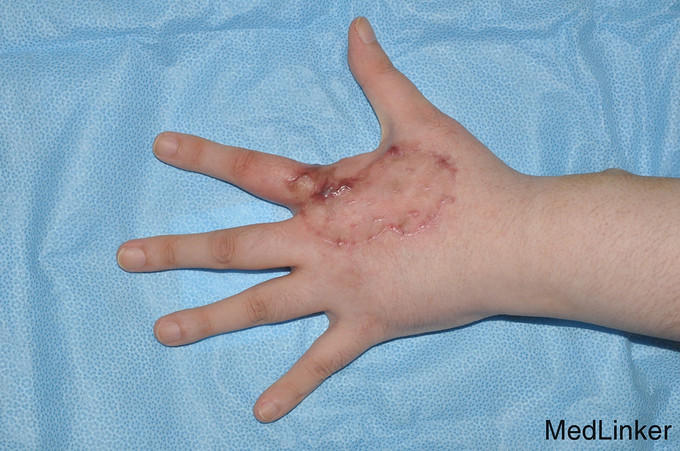 随访:术后皮瓣末端约直径1cm左右血运略差,反复换药后疤痕愈合,植皮存活良好。术后伸肌功能恢复可。 讨论:该例患者为肾移植术后,长期服用免疫抑制剂,容易发生皮肤的癌症,最常见的是非黑素瘤型皮肤癌,依次常见为:1)鳞状细胞癌:肾移植术后最常见的皮肤癌,与日晒时间有关。主要表现为头颈、手背皮肤红色、鳞状隆起,皮损难以愈合,发病率大约是普通人群的65倍。2)基底细胞癌:肾移植术后发病率第二位的皮肤癌,主要表现为皮肤上小的粉红色隆起或斑疹,可反复破溃、流血再形成硬皮,发病率大约是普通人群的10倍。3)黑色素瘤:最具侵袭性的皮肤癌,主要表现为皮肤上褐色、红色、黑色的斑点,发病率大约是普通人群的3~4倍。4)Kaposi’s肉瘤:主要表现为红色、粉色、紫色的斑片或皮疹,肾移植患者发病率仅为0.5%。 该例为皮肤乳头状瘤,系表皮乳头样结构的上皮增生所致,同时向表皮下乳头状延伸,易恶变为皮肤癌。