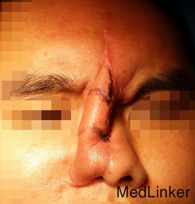 患者因外伤造成右侧鼻翼缺损2+年,4+月前于我科行额部扩张器植入术,2+月前行额部皮瓣转移成形术+鼻翼修补术